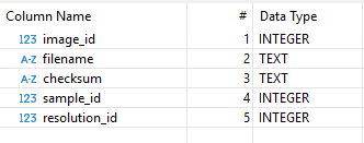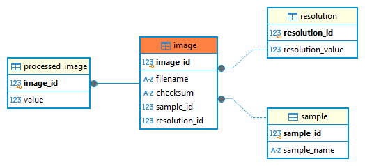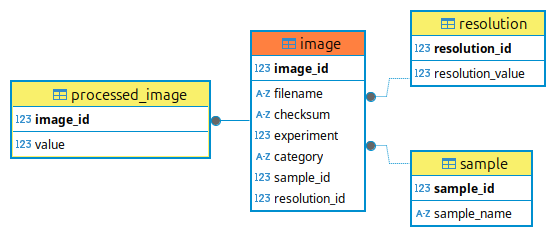 As in the examples above, we have images of different samples acquired with different resolutions entering the Image model. We use those lines to make some calculations and we obtain the rows in the ProcessedImage model. These two tables are in 1 to 1 relation and this relation is enforced with a delete cascade, meaning that if we delete an element in the Image model, the corresponding one in the ProcessedImage will also be deleted.