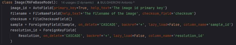To achieve this, in the CalibratedImage model, we need to add (line 57-58) an overload of the Meta class, where we specify our CompositeKey. Pay attention to an important detail: the CompositeKey constructor takes the name of the fields and not the name of the columns, that in the case of foreign keys differ of ‘_id’. Optionally we can also define a primary_key property (line 53-55) to quickly retrieve the values of our keys.